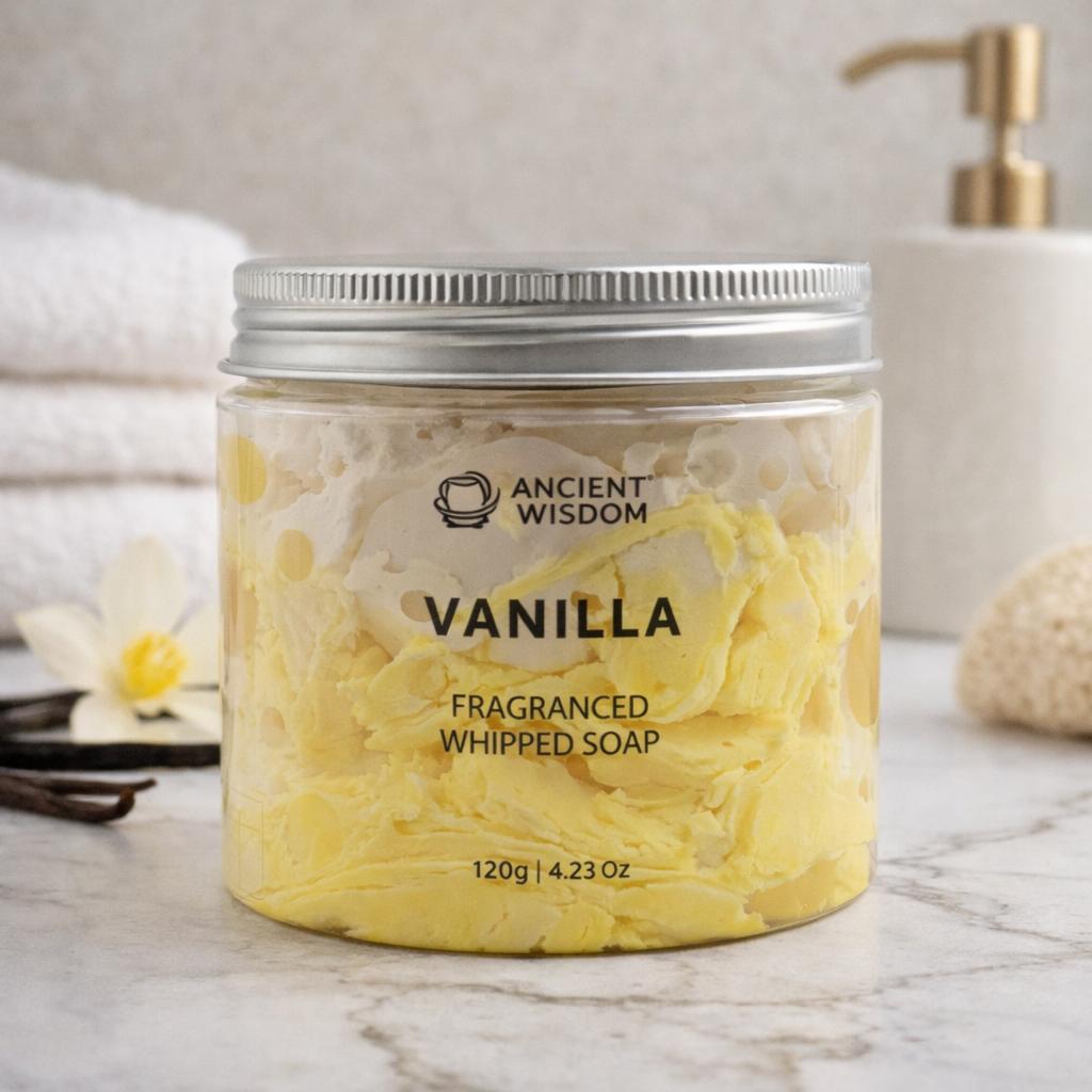 A 120g pot of hand-whipped soap in vanilla — cloud-soft, vegan, and made in the UK without parabens or SLS.