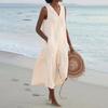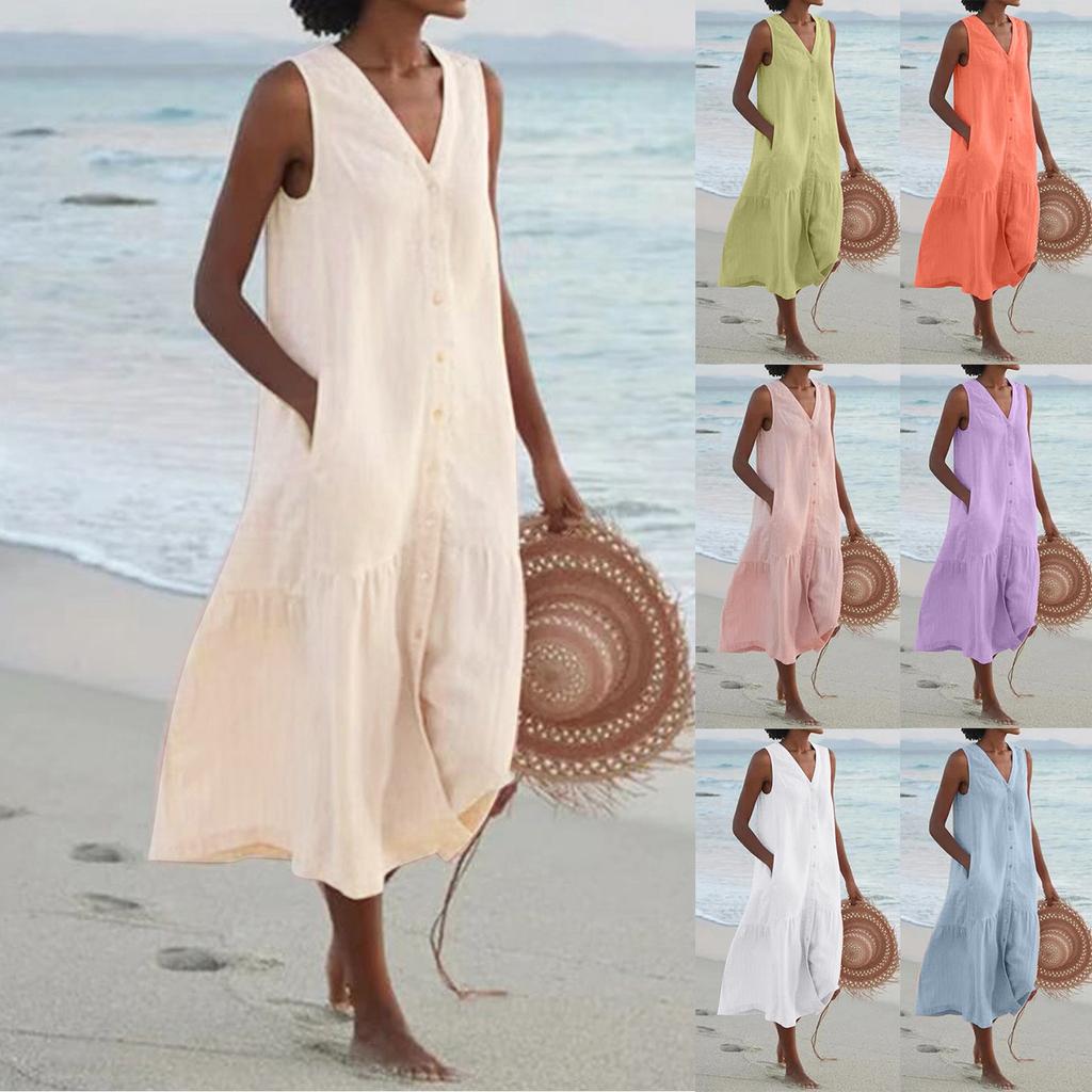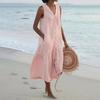 Women's Color Summer Dress Sleeveless V Neck Button Down Casual Pocket Swing Short Dress