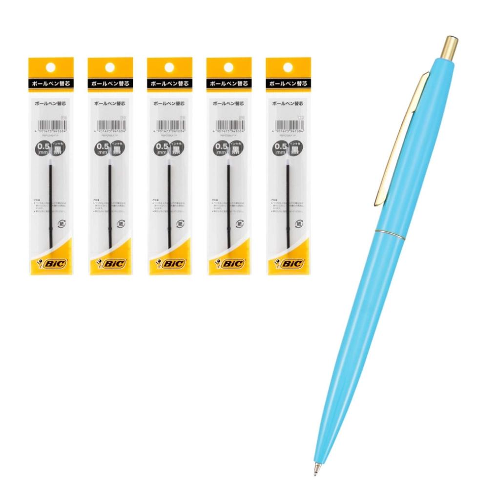 Bic Japan Click Gold Ballpoint Ice Blue Set of 5 0.5 Pen, Oil-Based, Black, Smooth, Barrel, Refills, (CLG05-IBLRF5)