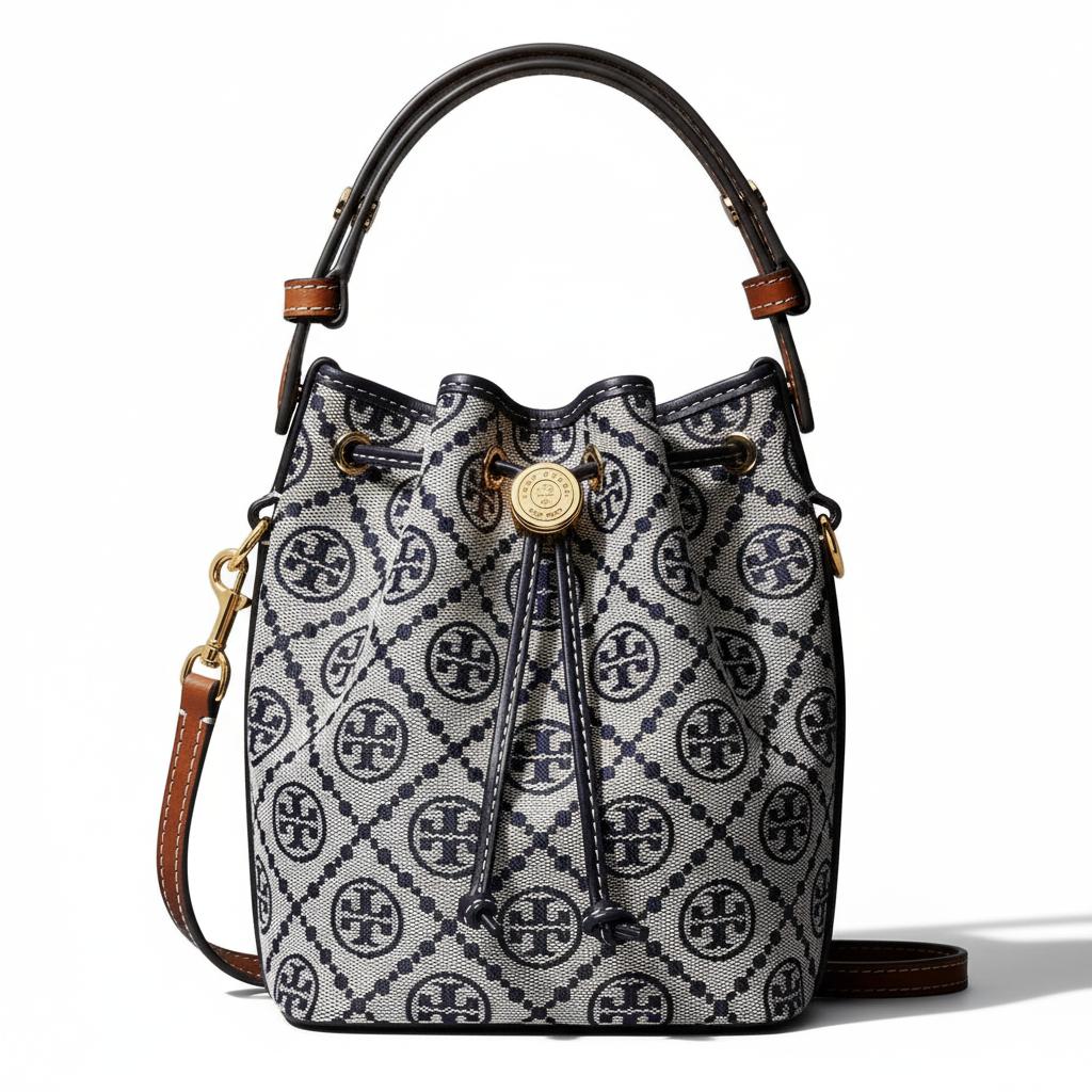 Tory Burch T Monogram Letter Pattern Metal Buckle Fabric And Leather Bucket Bag Mini Women Bags Navy-Blue Gray 181375-405