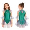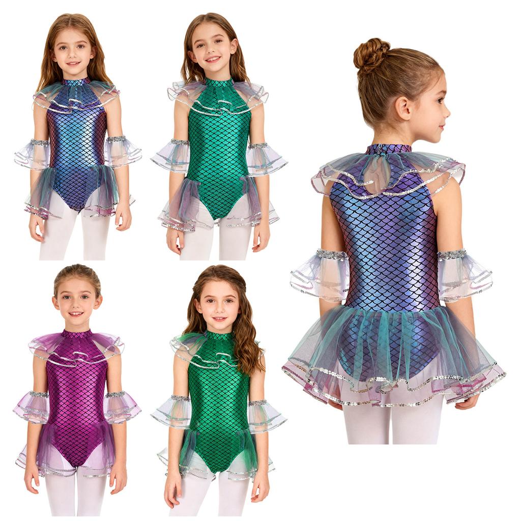 Kids Girls Mermaid Cosplay Costume: Sleeveless Mesh Sequins Bodysuit with Fish Scales Print & Arm Sleeves for Halloween Party