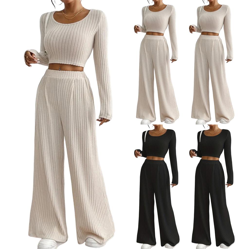 Women's Color Rib Knitted Trousers Mid-Waist Slimming Long-Sleeved Casual Suit