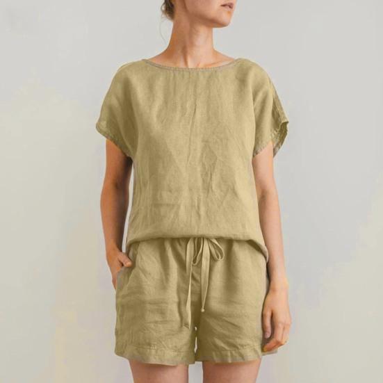 This women's short set is crafted from a mix of cotton and linen, ensuring breathability and comfort throughout the day. The loose fit of the suit not only complements your figure but also offers maximum comfort. Its simple solid color design makes it versatile for daily wear, suitable for various figures and ages.