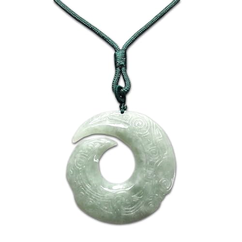 Material: AAA Natural Jadeite Magatama Shape Diameter: Approximately 45.5mm, Thickness: Approximately 4.5mm. Engraved with an auspicious pattern. Thick thread necklace, length up to approximately 60 cm, adjustable length.