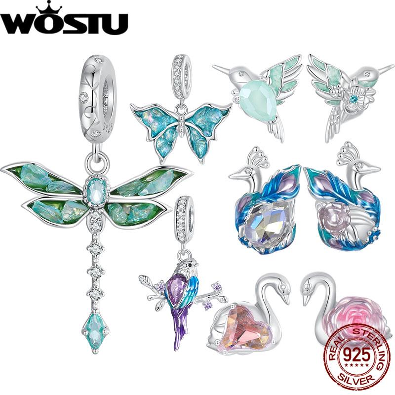 WOSTU 925 Silver Different Side Enamel Hummingbird Charm Heart Glass Bird Body Peacock Beads Fit Original Bracelet Gift