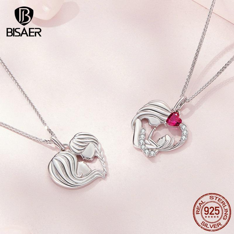 BISAER 925 Silver Mother & Child Pendant Necklaces Heart Charm Adjustable Chain For Women Mother's Day Birthday Jewelry