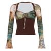 Long Sleeves Transparent Flower T-shirt Pleated Slim Crop Tops V-neck Printing Corset Travel