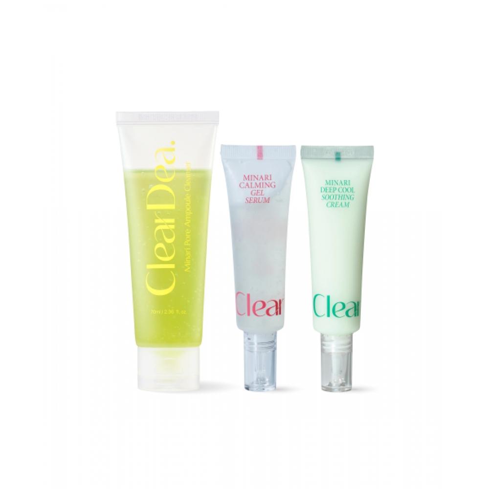 CLEARDEA Minari Pore Trio Single Set consists of Minari Pore Ampoule Cleanser, Minari Gel Serum, and Minari Deep Cool Soothing Cream. This product focuses on managing excess oil and pores, offering gentle care based on Minari ingredients.