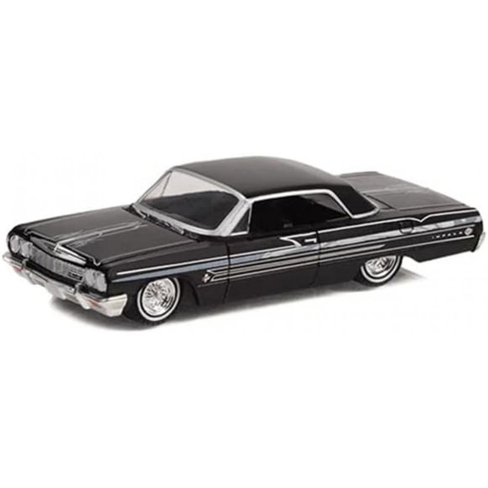 The 1:64 Greenlight Mino Lowriders 1964 Chevrolet Impala SS BK is a classic car model with distinctive style and detailed features. It comes with a safety warning: 'Do not put in your mouth.' Currently, it is part of Greenlight’s LOWRIDERS series and is beloved by car modeling enthusiasts.