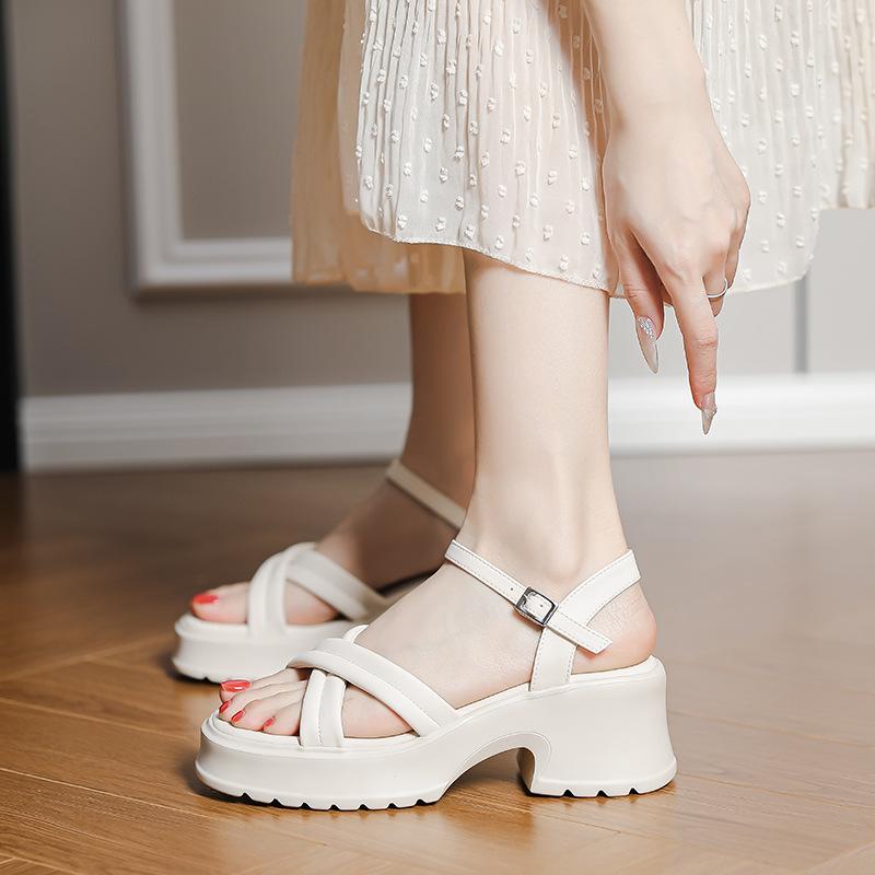 Not Tired Feet Increase Height, Soft Thick Bottom Summer New Wide Strip Cross Belt One-word Buckle Muffin Roman Sandals Women