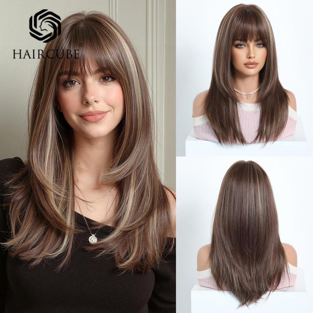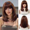 European Style Brown Medium Long Wig with Full Bangs for Women - High-Temperature Fiber