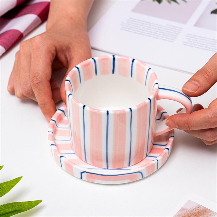 280ml/9.5oz Afternoon Tea Coffee Cup, Minimalist Striped Hand Drawn Cup and Plate Set, Ceramic Milk Coffee Cup, Household Drinki