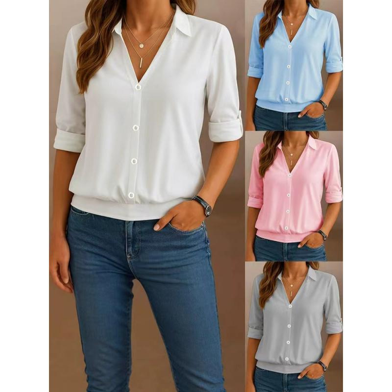 Summer Shirt New Women Casual Button Tops V-Neck Solid Color Blouse