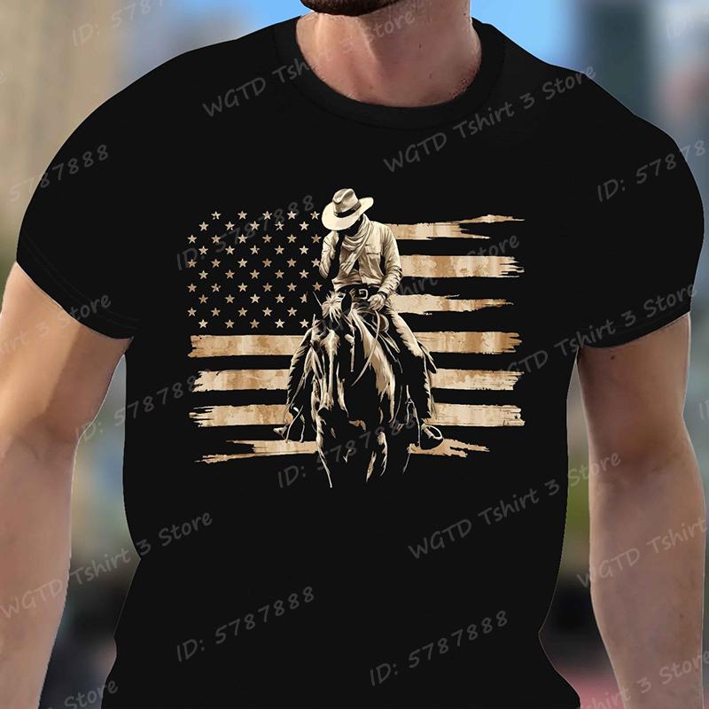 Cowboy with American Flag Pattern Print T Shirt Tees for Men Casual Short Sleeve TShirt for Summer Vintage Graphic Tshirts