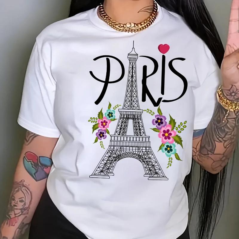 Paris Eiffel Tower Printed Crew Neck Casual TShirt for Summer Spring Women Aesthetic Clothes High Quality Cotton Shortsleev
