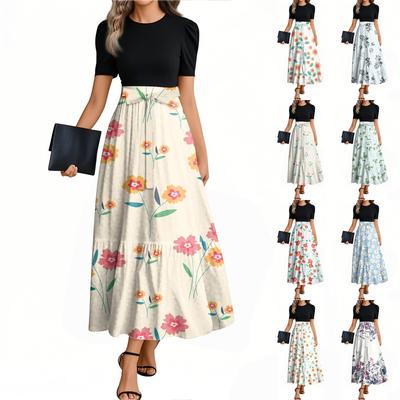 Women's Fashion Casual Belt Short Sleeve Round Neck Floral Stitching Elegant Temperament Dress