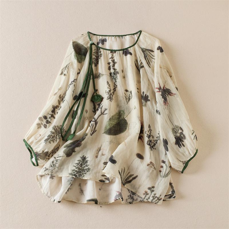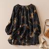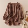 Women's Cotton Linen Shirt Vintage Blouses Loose Floral Short Sleeves Top O-Neck Ladies Clothing