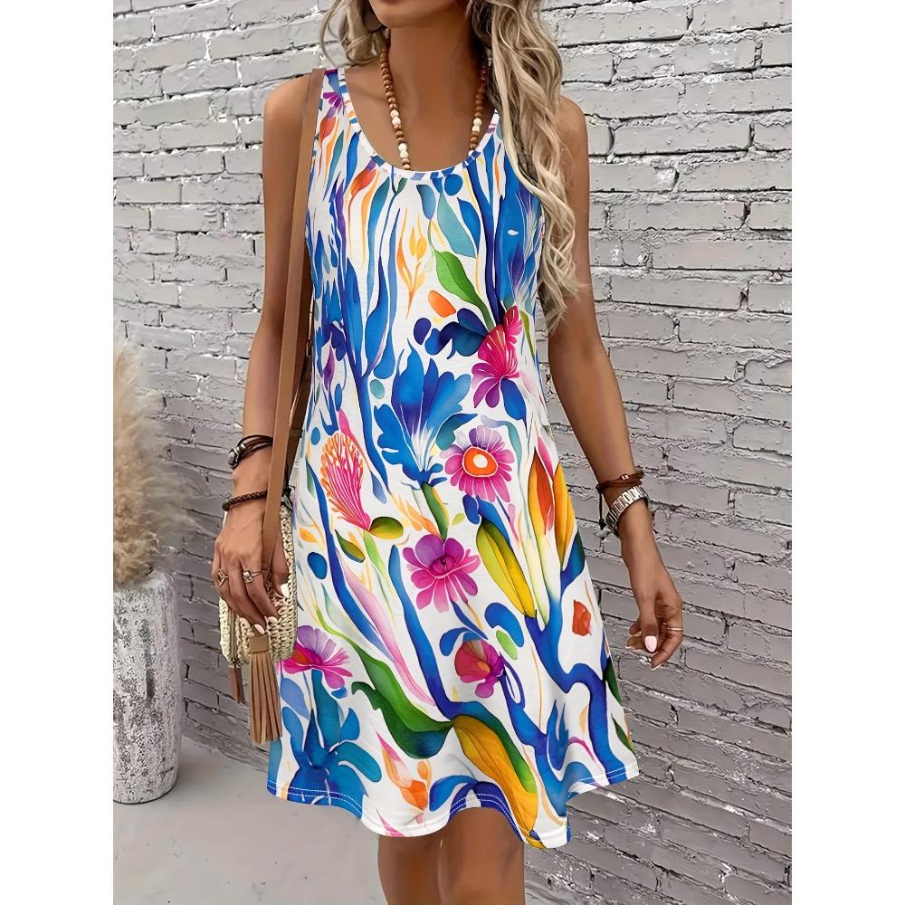 Abstract Floral Print Women's Casual Sleeveless Tank Dress Summer Vacation Casual Attire Fashion Street Wear Y2k Woman Clothing