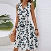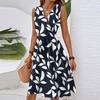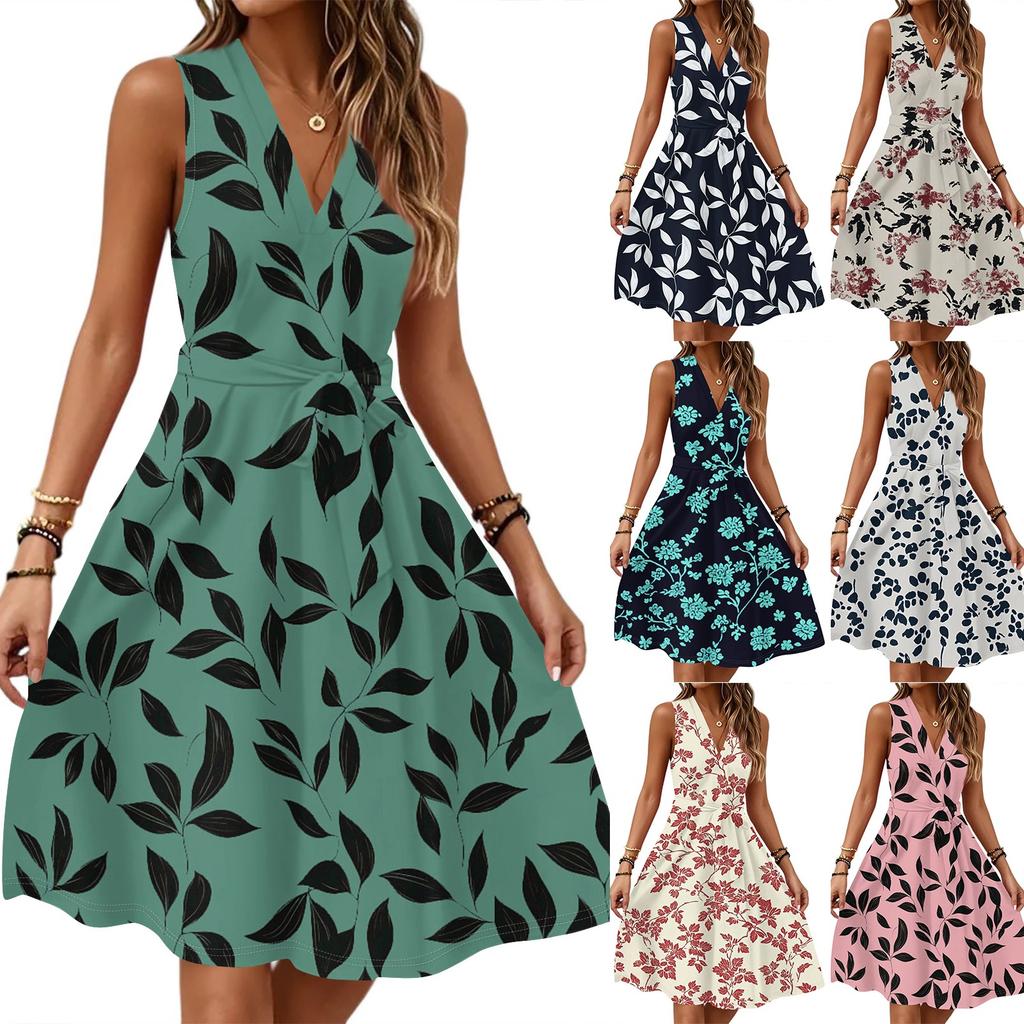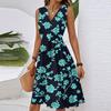 Women's Spring Summer Casual V Neck Sleeveless Waist Floral Print Midi Dress