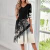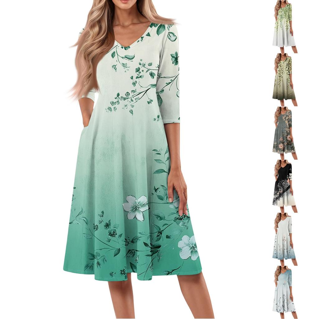 Women's Casual Fashion V Neck Three Quarter Sleeve Print Midi Dress