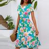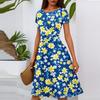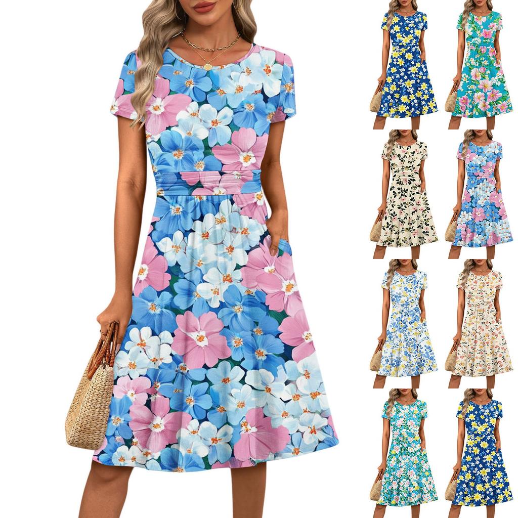 Women's Casual Fashion Round Neck Pleated Short Sleeve Floral Print A-Line Midi Dress
