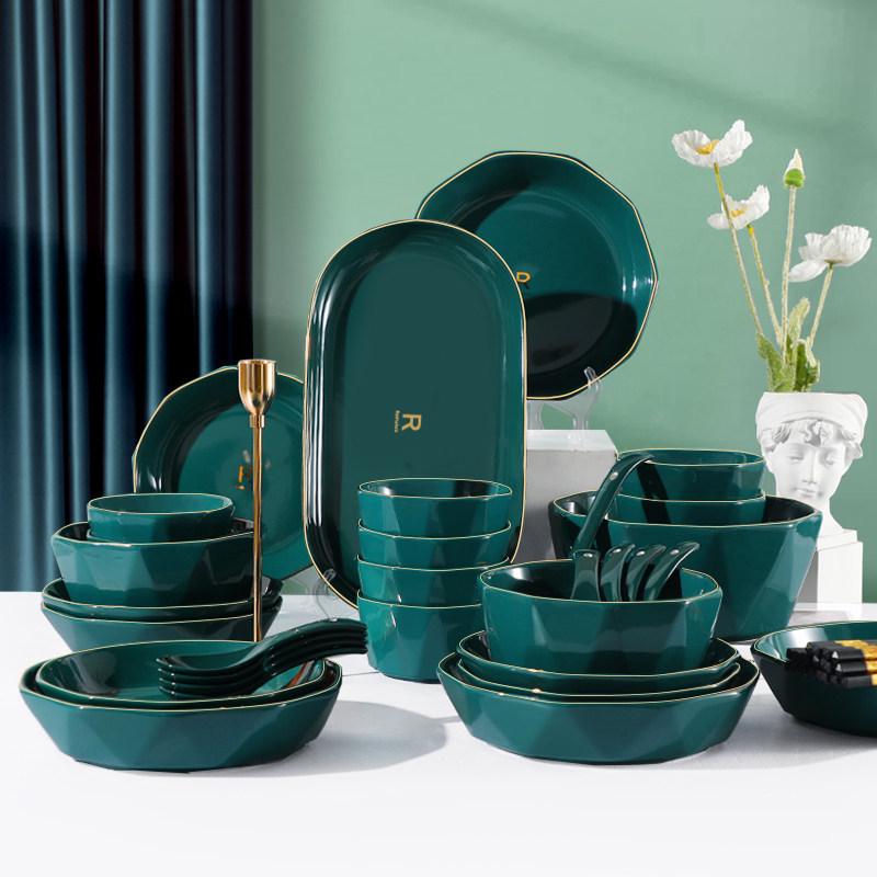 Luxury Peacock Green Tableware Set: Gold-Rimmed Bowl & Plate