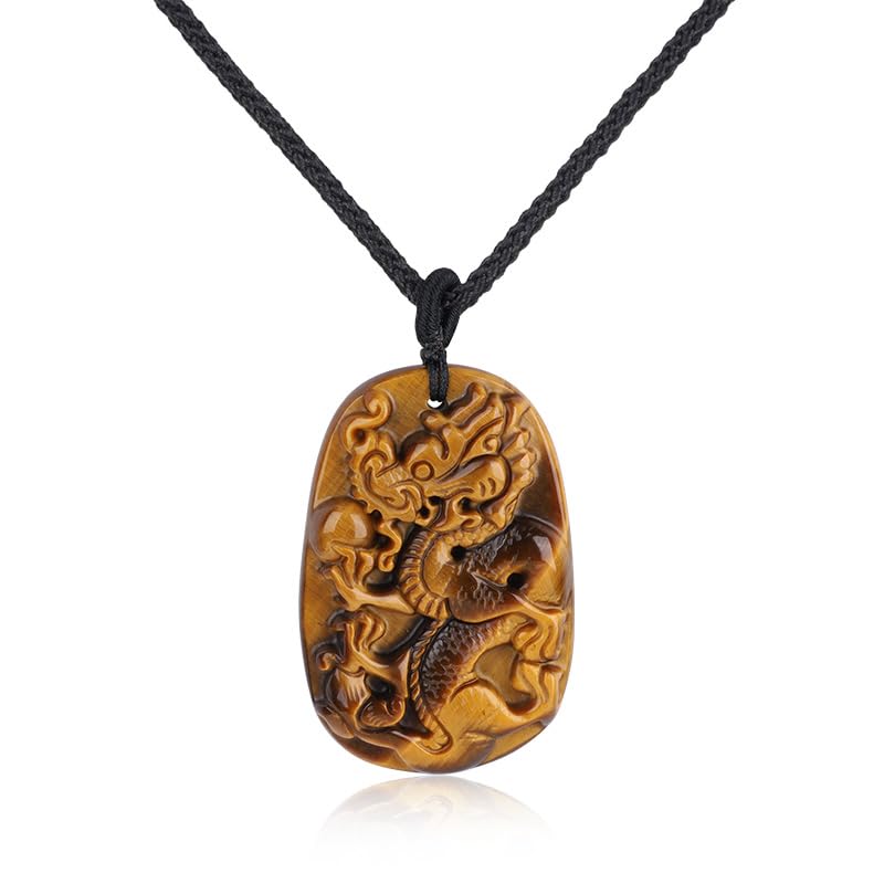 This tiger's eye pendant features a meticulously carved dragon pattern, making it a recommended power stone necklace for those born in the Year of the Dragon or those seeking a lucky charm.