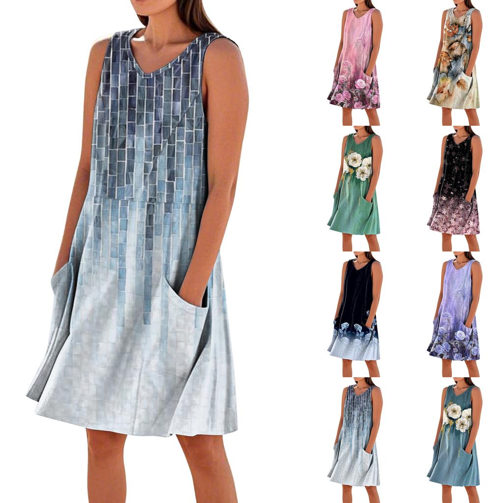 Summer Dresses For Women Loose Beach Vacation Casual Sleeveless V-neck Sundresses With Pockets Tank Dress