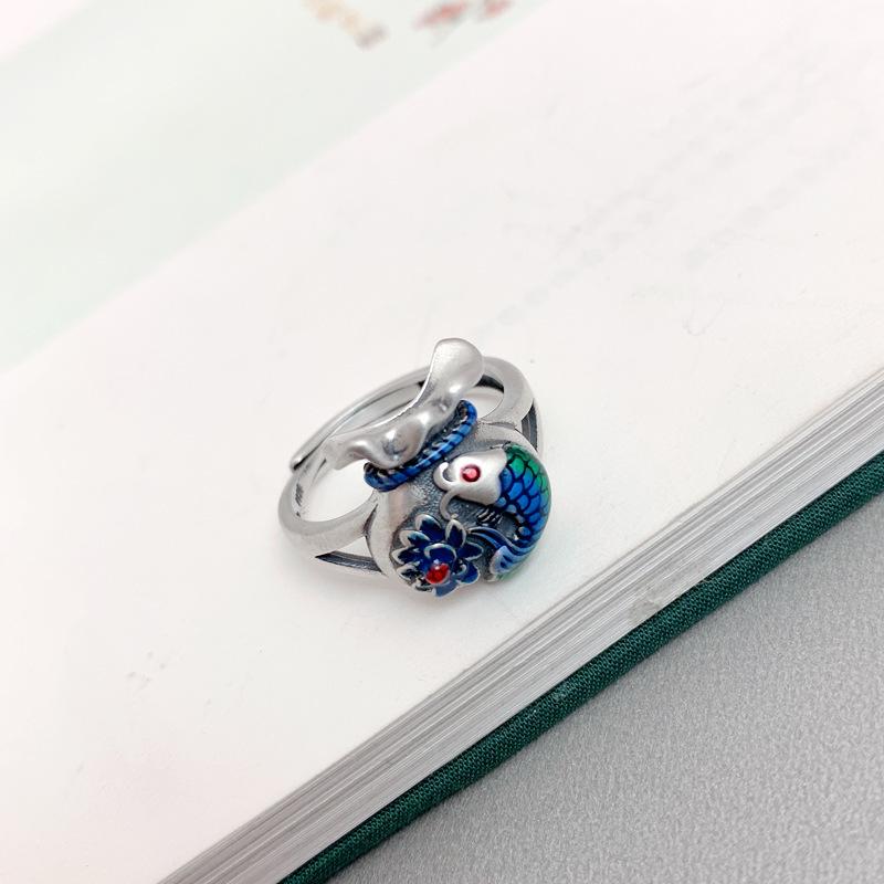 Adjustable 925 Sterling Silver Lotus Fish Ring for Men & Women - Chinese Style
