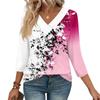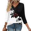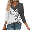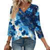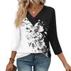 Women's Print Top Button-down V-neck T-shirt 3/4 Sleeve Loose Fashion Top