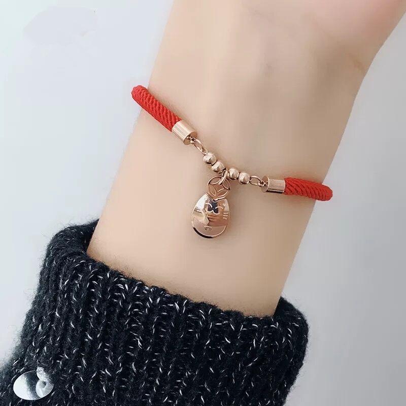 Fashionable Rose Gold Cat Bracelet with Red String for Women - Titanium Steel Jewelry.