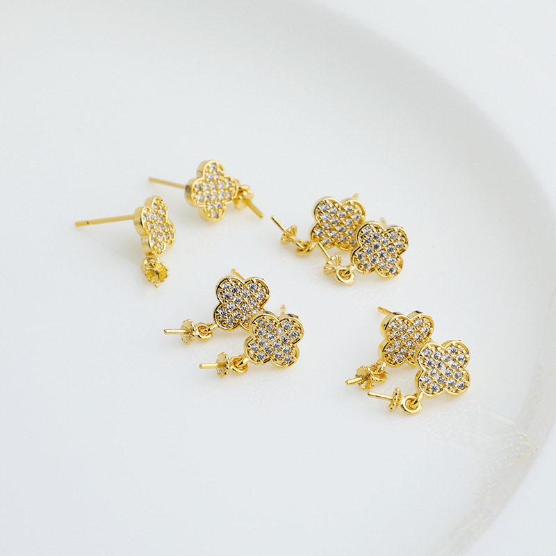 Copper-Plated 14K Gold Four-Leaf Clover Zircon Stud Earrings with Sheep's Eye Needle Empty Setting for DIY Jewelry Making