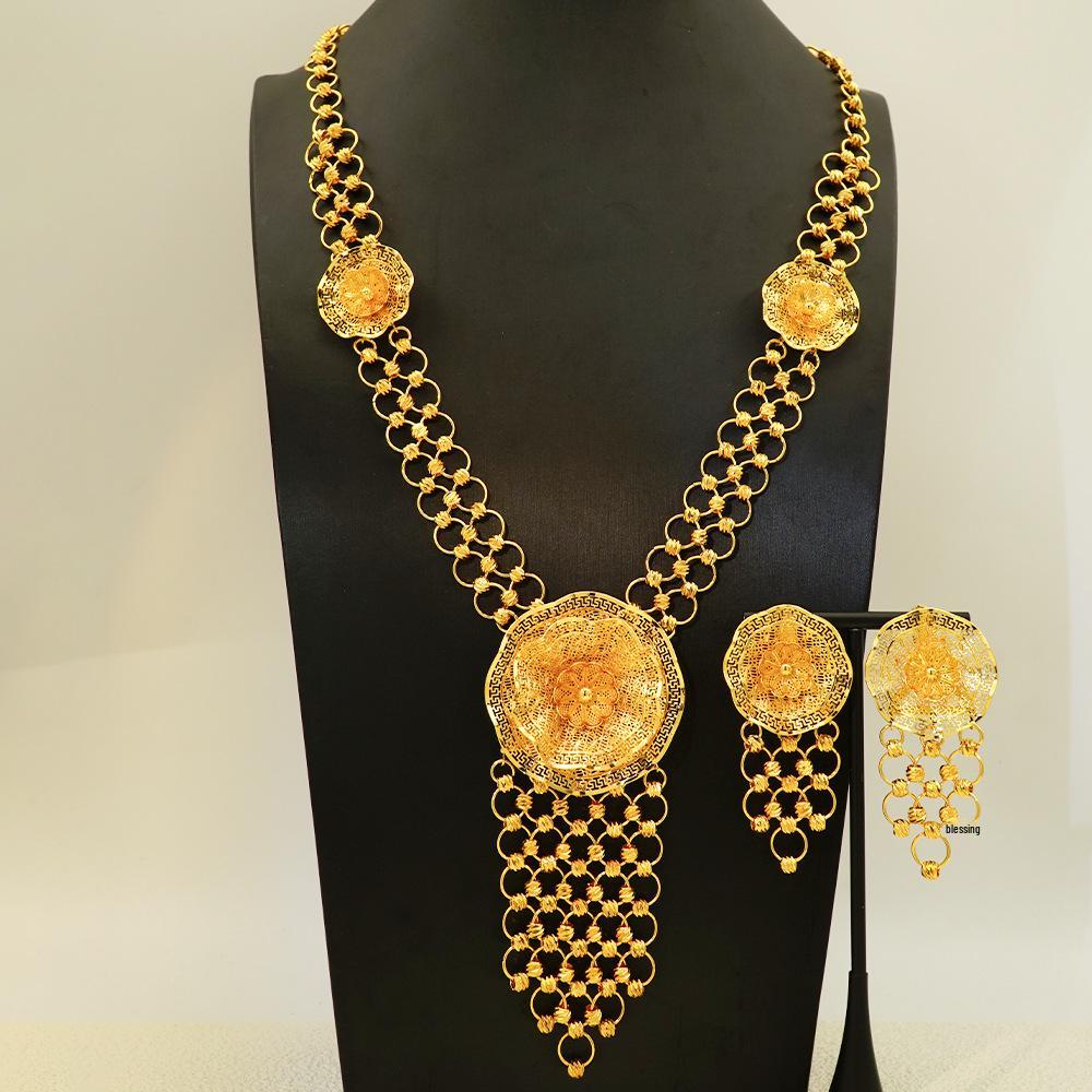 Gold-Plated Flower Tassel Jewelry Set for Women - Middle Eastern Retro Wedding Banquet Necklace and Earrings