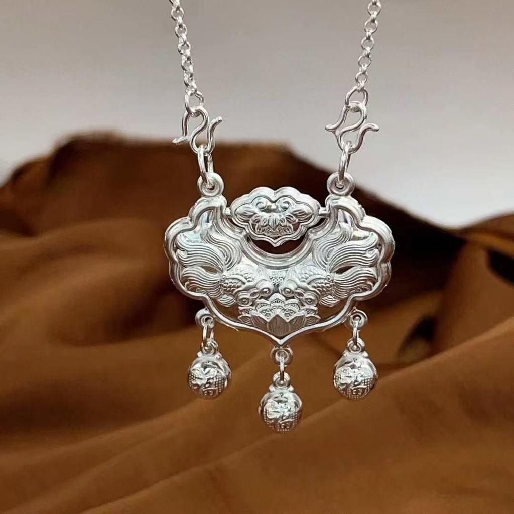 Sterling Silver Lotus Longevity Pendant: Retro Chinese Peace Lock Necklace for Women - Pure Silver Charm Gift.