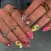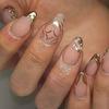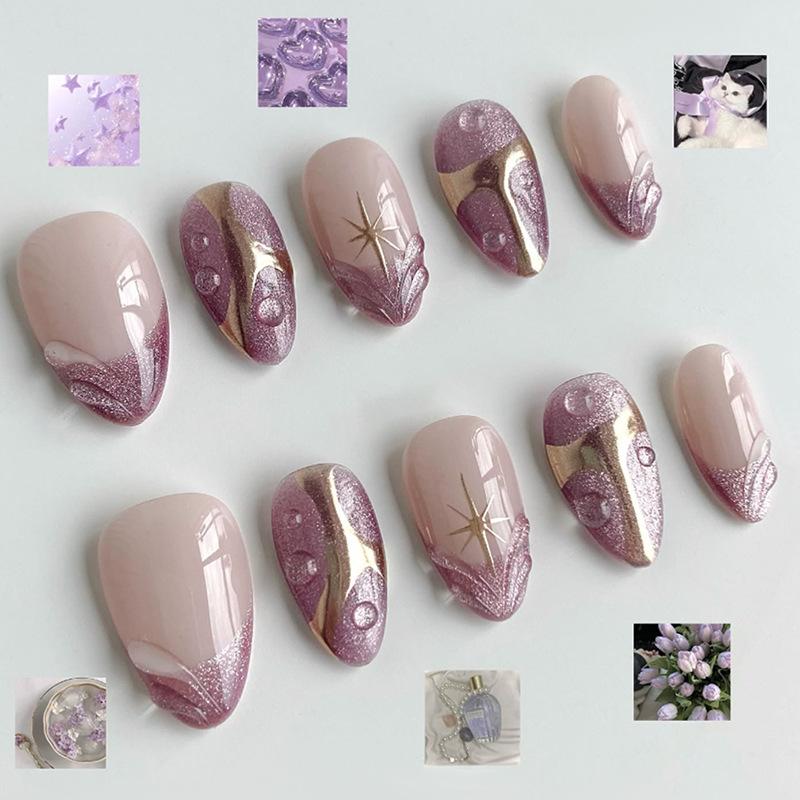 24PCS Purple Cat Eye French Fake Nails Aurora Golden Star Pattern Almond Press On Nails Full Cover Fashion 3D Ripple False Nails