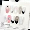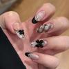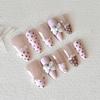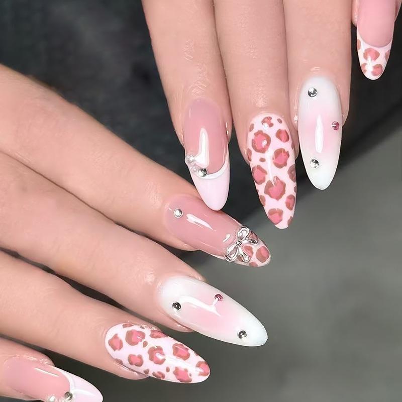 24PCS Pink Leopard Print Blush Almond Press On Nails Sweet Bowknot False Nails Simple French Fake Nails with Diamond Wearable