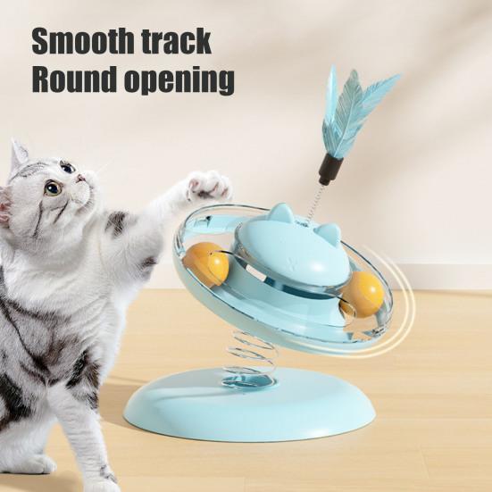 This turntable funny cat toy combines fun and functionality to keep your feline entertained and mentally stimulated. Featuring a built-in leakage hole, it can be filled with cat food or snacks, allowing your cat to slowly access treats while chasing the smoothly rotating turntable.
