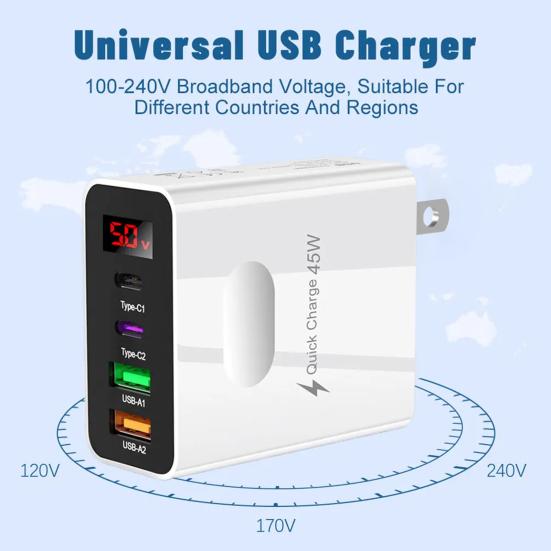With 4 simultaneous charging ports - 2 USB ports and 2 Type-C ports - this charger offers a total power output of 45W, allowing you to charge multiple devices simultaneously. Whether you're at home, traveling, or in the office, this compact and portable charger is designed for convenience and portability.