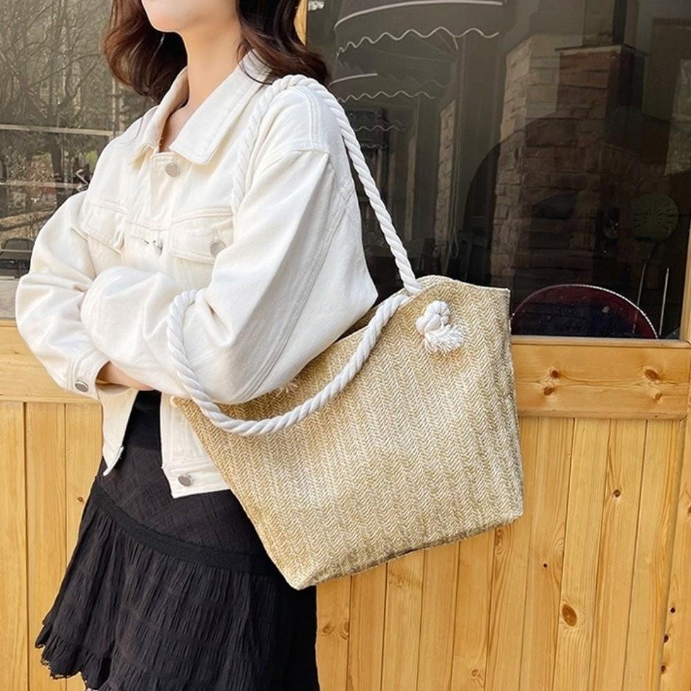 Solid Color Beach Handbag Large Capacity Underarm Shoulder Bag Casual Straw Tote Bag Travel