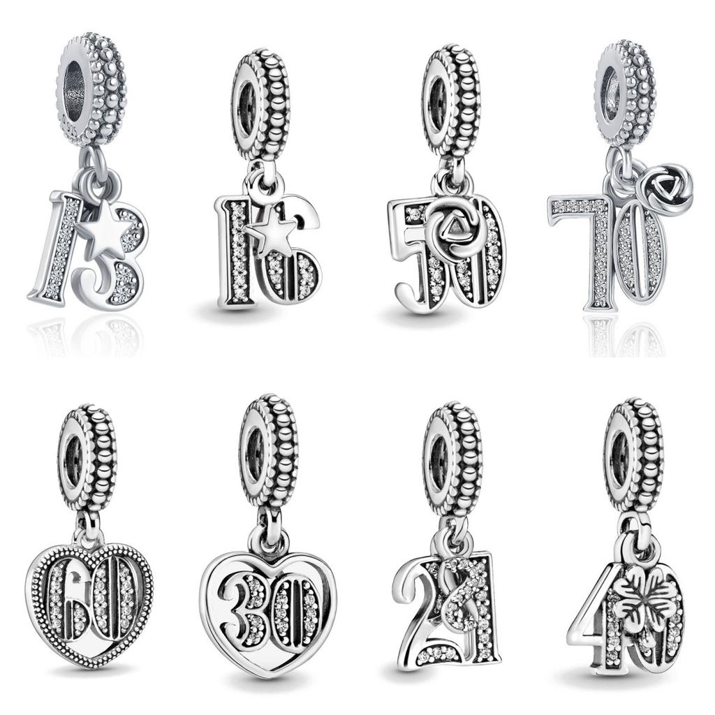 New 925 Silver Birthday Happy Number 12 16 18 30 Dangle Pendant Fit European Bracelet DIY Women's Accessory