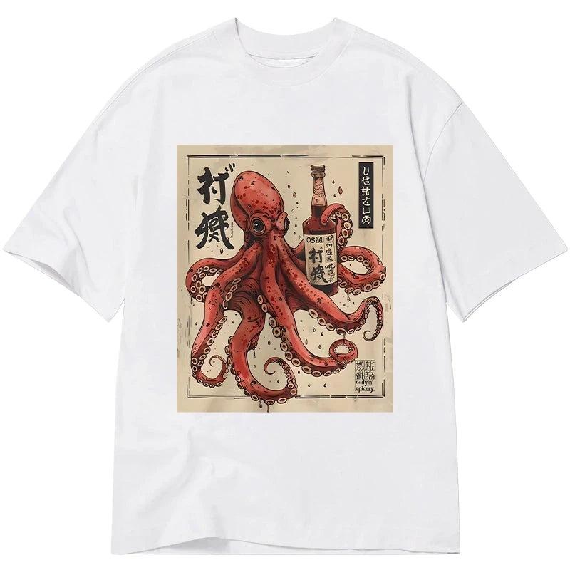 Vintage Retro Pure Cotton T-Shirt Casual Loose Osaka Octopus Classic T-Shirts Man Clothes Men's Holiday Japanese