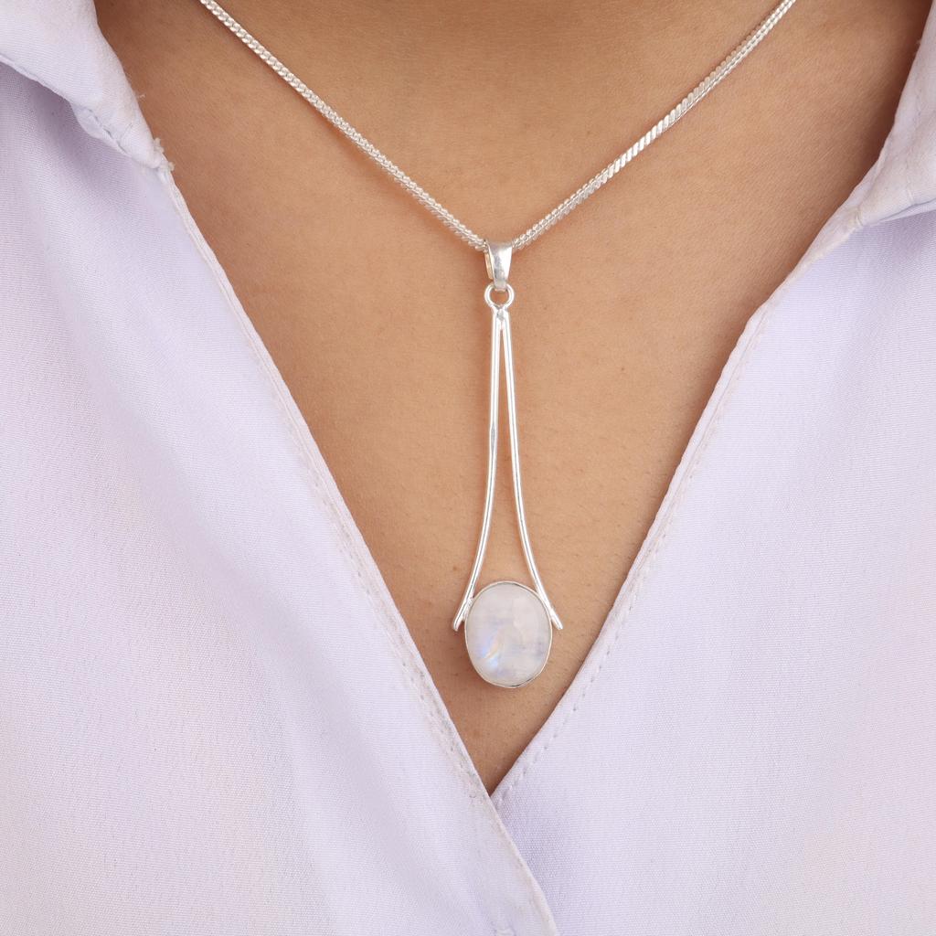 Natural Rainbow Moonstone Gemstone 925 Sterling Silver Handmade Jewelry Long Pendant 1.79" Gift For Love PP-69-35