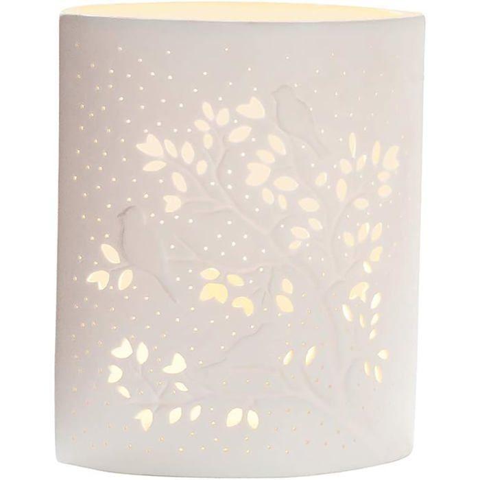 Lampe de table décorative - GILDE - Motif oiseaux sur arbre - Porcelaine blanche - H 20 cm - Douille E14