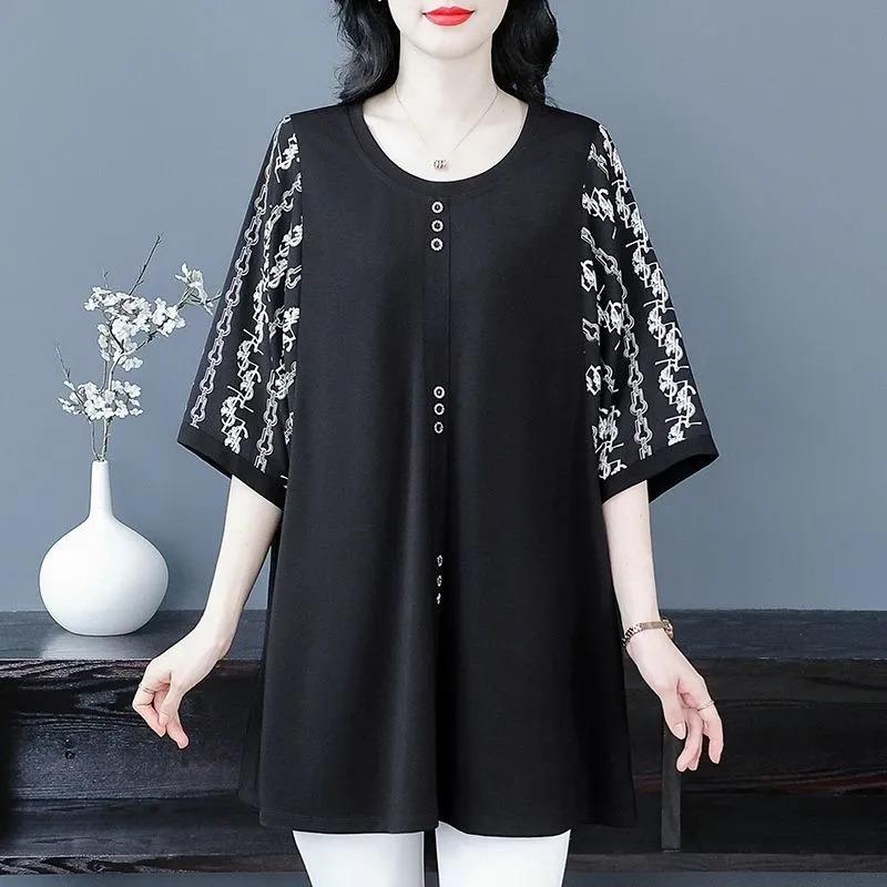 Mid-length Short-sleeved Patchwork Shirt Summer New Large Size Women's Temperament Age-reducing T-shirt Top
