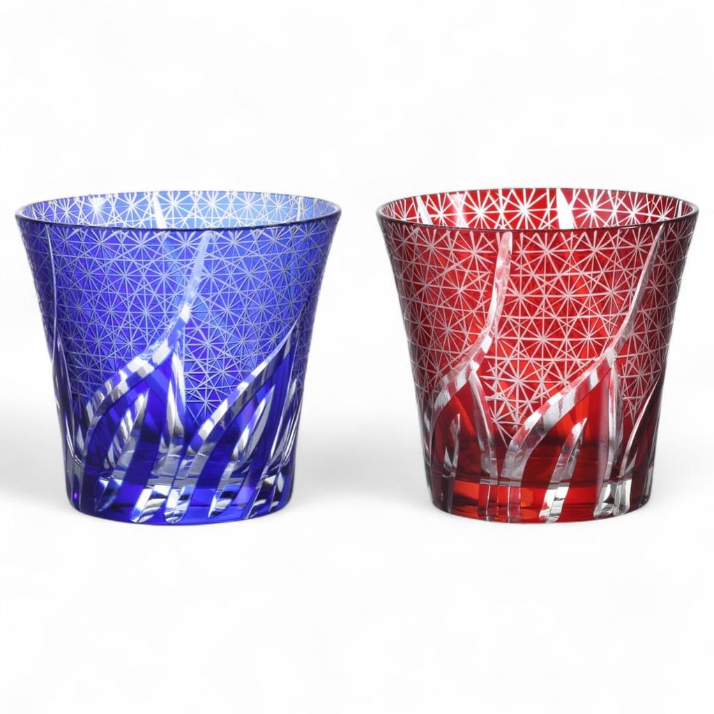 Mizukage Kiriko Pair Glass Cups 240cc Random Carving Small Pattern Blue Red with Engraved Base Bishou Current Model J-kitchens 94xH85mm &