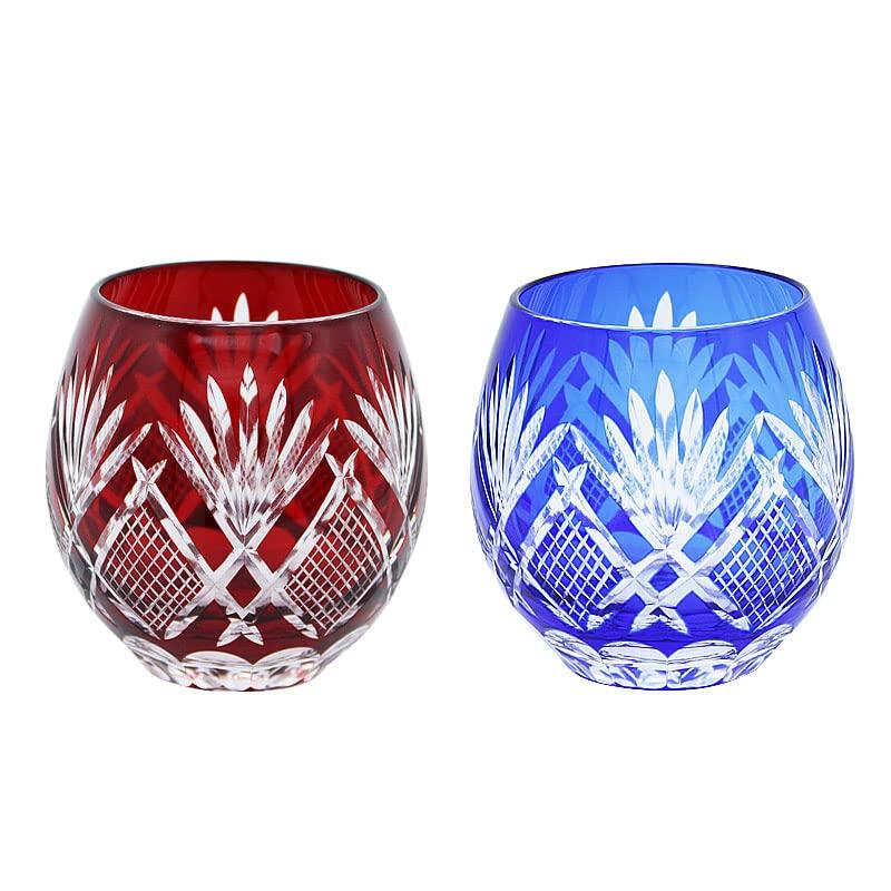 Kiriko Glasses Pair of Cut Glass Glasses Perfect for Cold or Hot Drinks Ideal for and 60th Birthday (Red & Blue) - - Sake, Shochu, Water, -