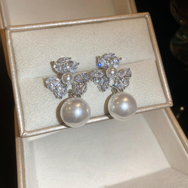 Elegant Floral Silver Plated Zircon Pearl Dangle Earrings For Women Home Party Wear