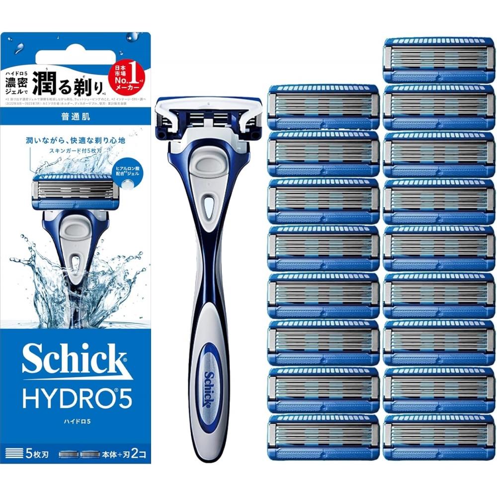 The Schick Hydro 5 Basic Holder + Replacement Blade Set is an innovative razor that boasts excellent moisturizing benefits. It features a built-in moisture gel that gently cares for the skin during shaving, transforming into a gel-like consistency when in contact with water. It contains aloe and Vitamin E, as well as hyaluronic acid to maintain skin hydration. The '5-blade skin guard' controls movement on the skin to reduce friction, while the 'Water Through Structure' allows for easy rinsing of leftover hair and shaving cream. The 'Flip Trimmer™' offers convenience for shaving detailed areas easily.