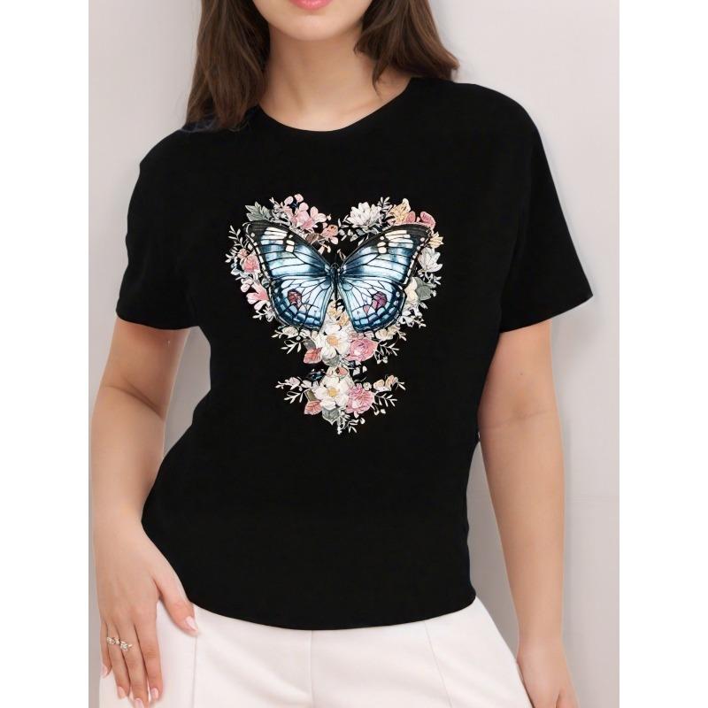 Butterfly Print Crew Neck T-shirt, Casual Short Sleeve Top For Spring & Summer, Women's Clothing