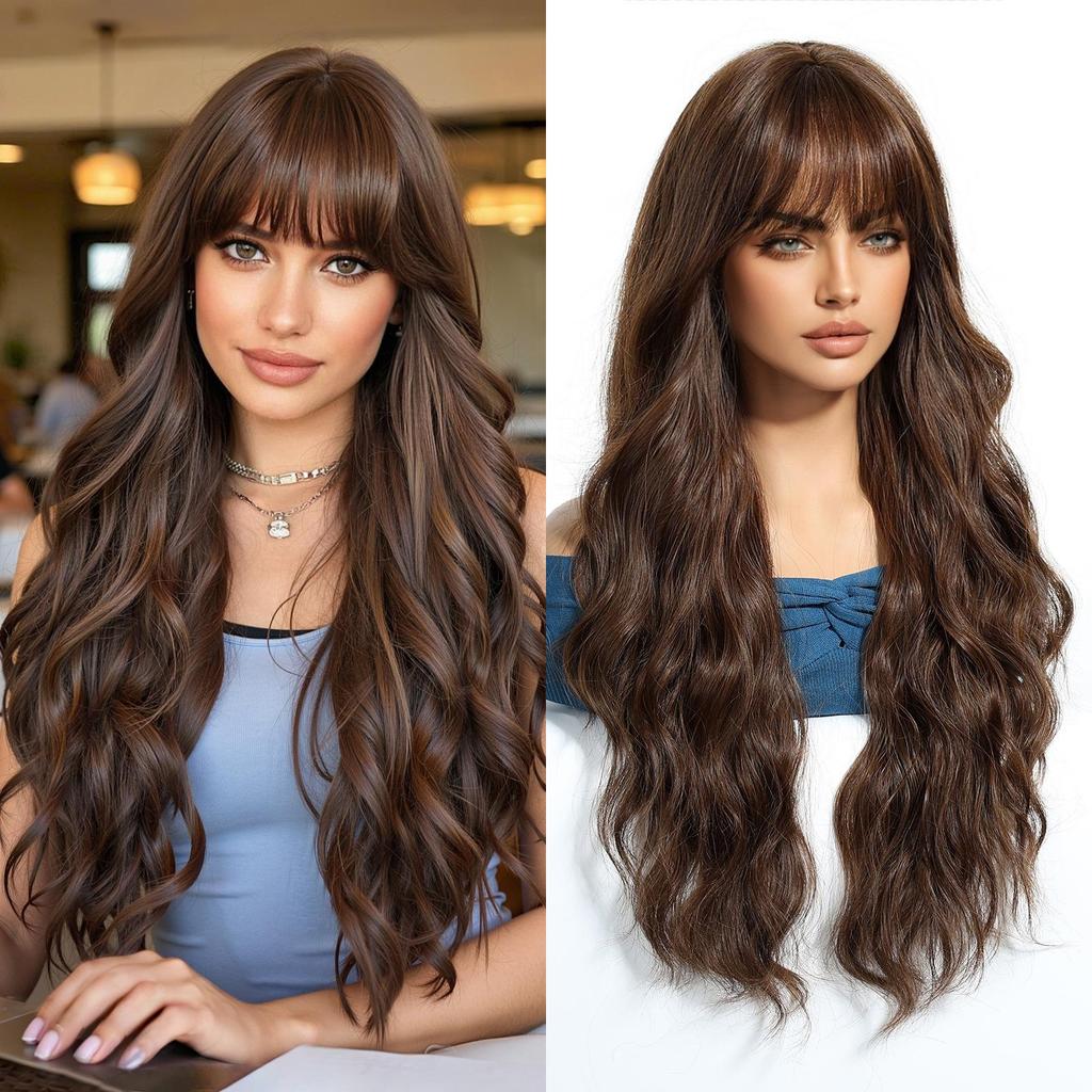 European and American Fashionable Women's Long Curly Hair Wig, Brown Water Ripple Fringe Bangs High Temperature Silk Synthetic Wig Headband